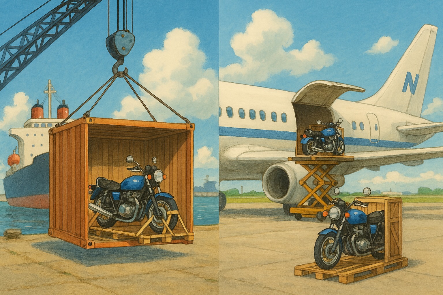• Контейнерная перевозка, как правило, обходится дороже при отправке одного мотоцикла — следует рассчитывать на общую сумму от 250 000 иен и более, включая упаковку, таможенное оформление и портовые сборы.
